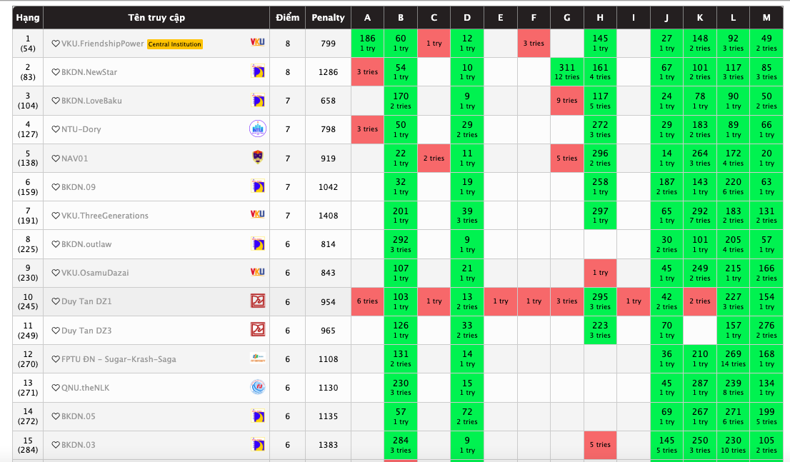 Bảng xếp hạng Final Scoreboard các đại học miền Trung cho thấy sự “áp đảo” các đội mạnh đến từ ĐH Đà Nẵng. Dẫn đầu là đội VKU.FriendshipPower đến từ Trường ĐH CNTT & TT Việt - Hàn (VKU), với 8 bài giải và 799 penalty - kết quả ấn tượng thể hiện sự ổn định và tốc độ xử lý bài cao. Trong Top 15 có đến 6 đội của Trường ĐH Bách Khoa - ĐH Đà Nẵng và 3 đội của VKU - khẳng định vị thế trung tâm đào tạo lập trình viên hàng đầu miền Trung.
