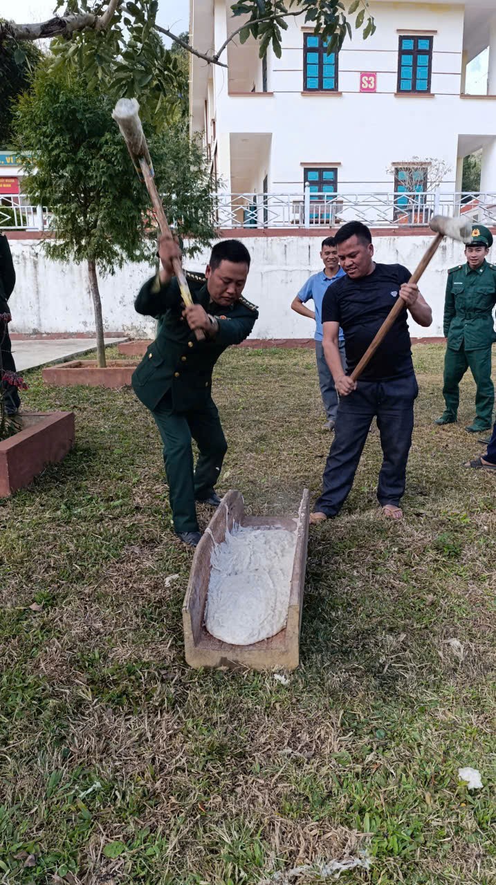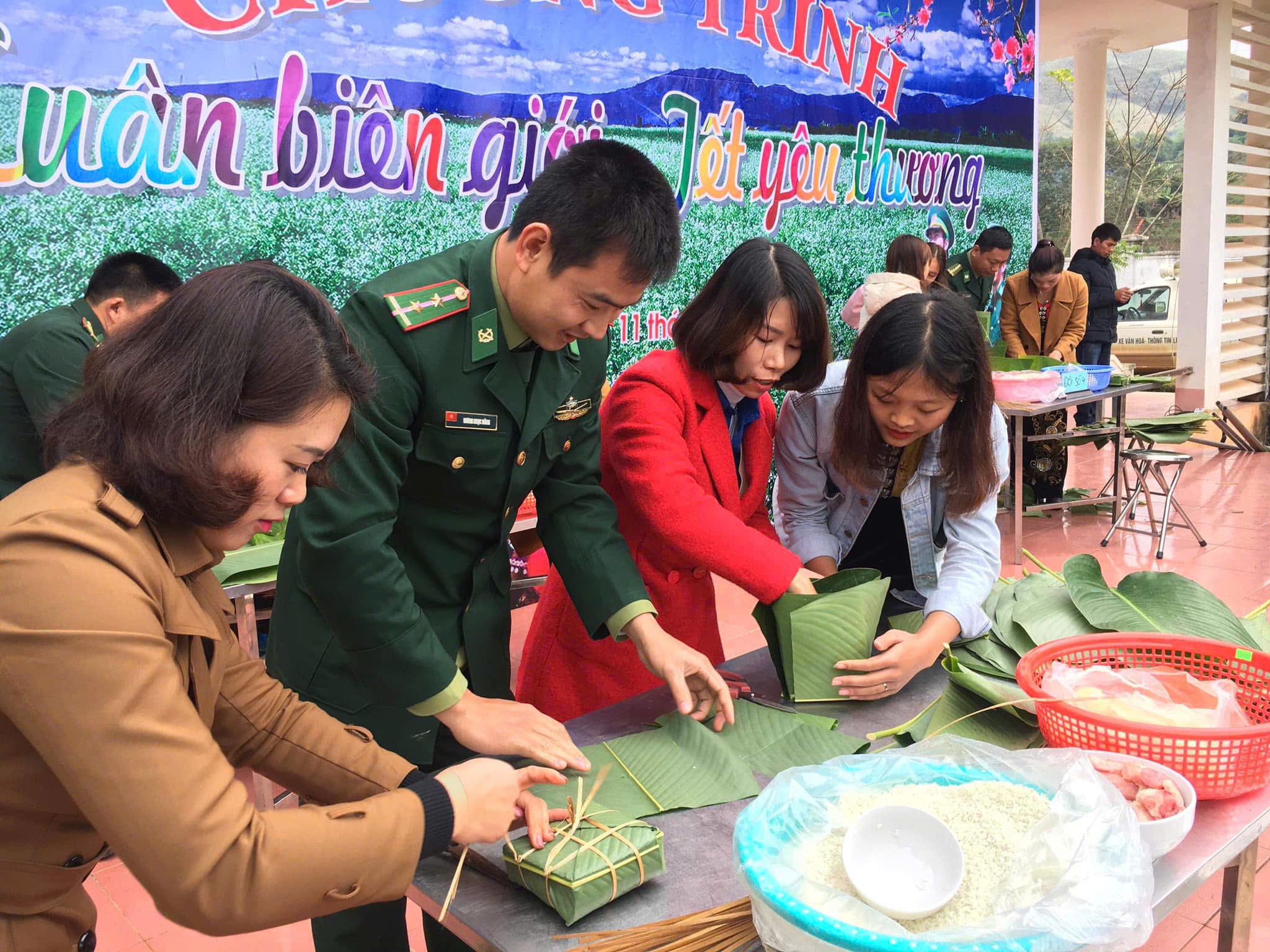 Các chiến sỹ Đồn Biên phòng Cửa khẩu Quốc tế Lóng Sập gói bánh chưng cùng bà con