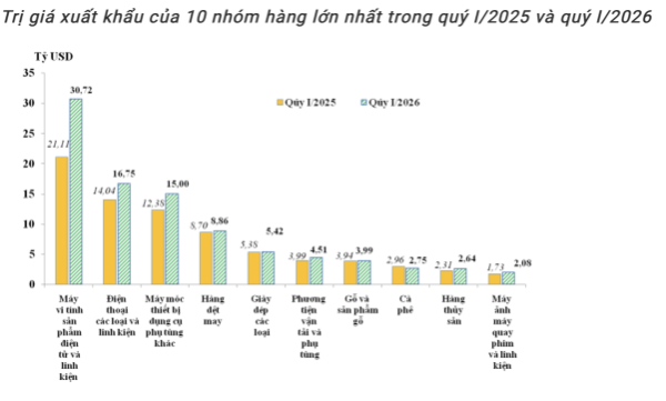 Riêng nhóm máy vi tính, sản phẩm điện tử và linh kiện tiếp tục giữ vai trò dẫn dắt với kim ngạch tháng 3 đạt khoảng 13 tỷ USD, nâng tổng giá trị xuất khẩu quý 1 lên 30,72 tỷ USD, chiếm khoảng 25% tổng kim ngạch xuất khẩu cả nước. So với cùng kỳ năm trước, nhóm hàng này tăng mạnh 45,5% (tương ứng tăng 9,61 tỷ USD).